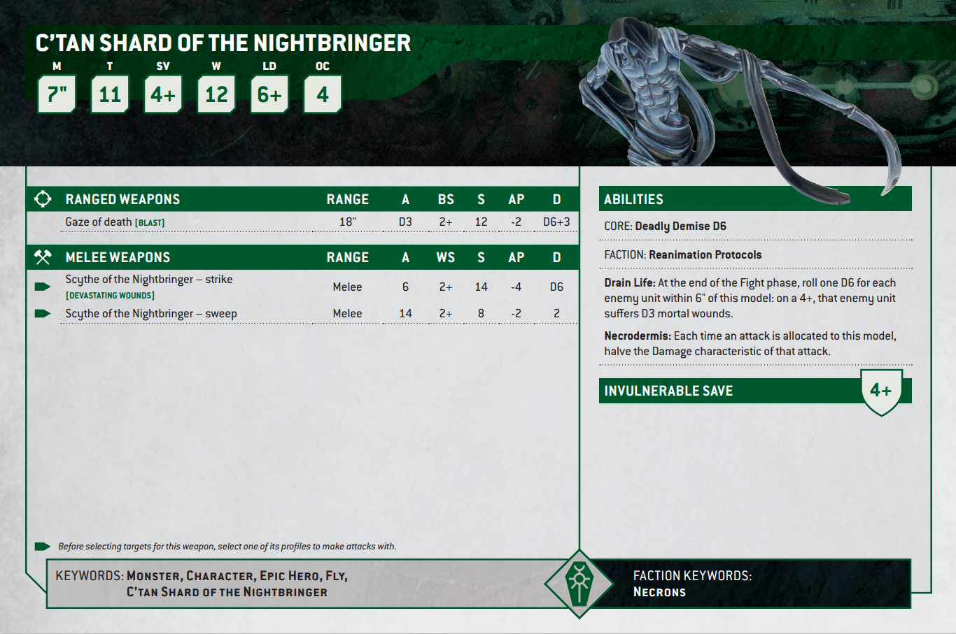 다만 그렇다고 정말 무적이라는 소리는 아닙니다. 9판처럼 아예 받는 데미지 자체를 제한하진 못하기에 예전처럼 자신있게 밖에 꺼내두면 바로 화력집중 받아서 ‘크탄이었던 것’이 되어버리거든요. 하지만 그 대가로 포인트도 다 싸졌기에 장단점이 있고, 오히려 과거보다 확실하게 제 역할을 해줄 수 있게 됐기 때문에 개인적으로는 더 좋아졌다고 생각합니다. 워로드로 지정될 수 없다는 단 한 가지 제약 빼고는 모든 종류의 네크론 버프를 받을 수 있게 됐다는 점도 정말 큰 강점이구요.