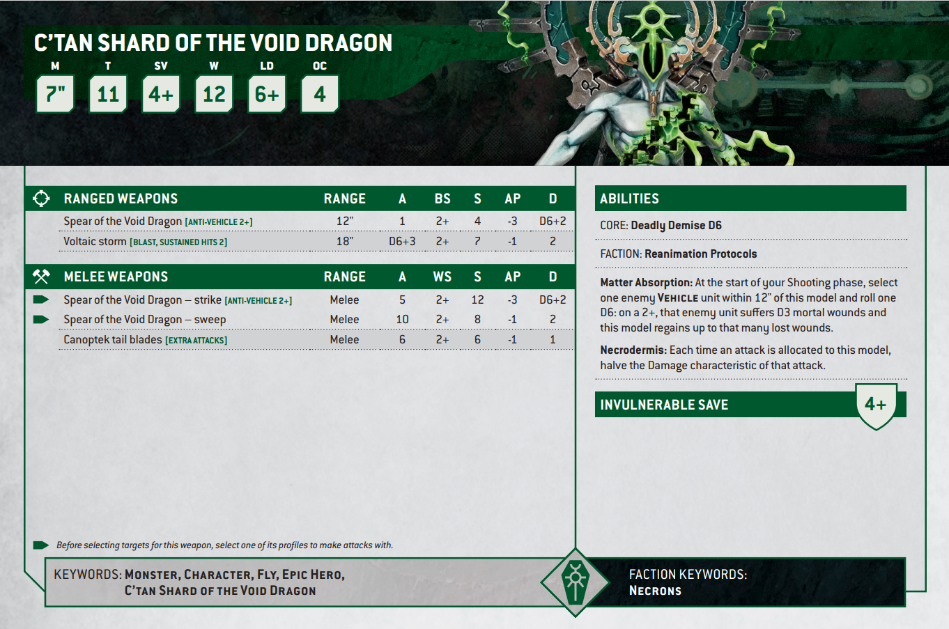 9판서는 국밥 그 자체였던 보이드드래곤이었지만 10판에선 다소 계륵이라는 느낌이 듭니다. 일단 차량 잡아먹는 괴물이라는 컨셉은 그대로 들고와서 안티비클을 들고온 건 좋았는데 사격 무장의 사거리가 너무 짧아요. 고작해야 12인치, 거기에 s는 또 4라 진짜 비클한테만 던질 스펙인데 대부분의 비클이 적진 안쪽에 있는 걸 생각하면 거기까지 가다 터질 가능성이 매우 농후해요. 과거에도 12인치이긴 했지만 그래도 그땐 운드 제한이 있어서 그거 믿고 상대 안쪽까지 들어갈 수 있었는데 이제는 그러기가 힘든만큼 12인치라는 짧은 사거리가 정말 치명적으로 다가옵니다. 또한 볼테익 스톰은 보병류 잡을만한 스펙이라 다 좋은데 하필 ap가 1인 것도 아쉬워요. 10판이 커버 받기가 정말 쉬워진만큼 ap1 정도는 금방 상쇄되어버리니 무용한 공격이 될 가능성이 좀 높기 때문입니다.