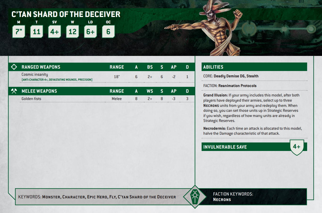 이렇듯 자체 스펙도 상당히 괜찮은데 크탄의 가장 큰 문제점인 느린 기동과 집중되는 화력을 피할 수단을 갖추고있어 포인트가 가장 비싼 크탄이 되었습니다. 충분히 납득이 가죠. 그리고 이 유닛의 장점은 그 뿐이 아닙니다. 크탄 초월체는 에픽히어로가 아니라 일반 캐릭터라 네크론 인핸스먼트에 접속이 가능합니다. 여기저기 돌아다녀야하는 초월체의 역할에 따라 소버린 코로넬을 주는 건 의미가 없지만 셈피터널 위브를 주게되면 얘기가 달라지죠. t11, w12, 4+인불, 절반뎀감, 4+필노라는 통곡의 벽 크탄이 탄생하게 됩니다. 혼자 다니는 초월체에게 딱 맞는 인핸스에다 포인트도 10밖에 안하니 해당 크탄을 쓰실 땐 꼭 달아주시는 게 좋아요.
