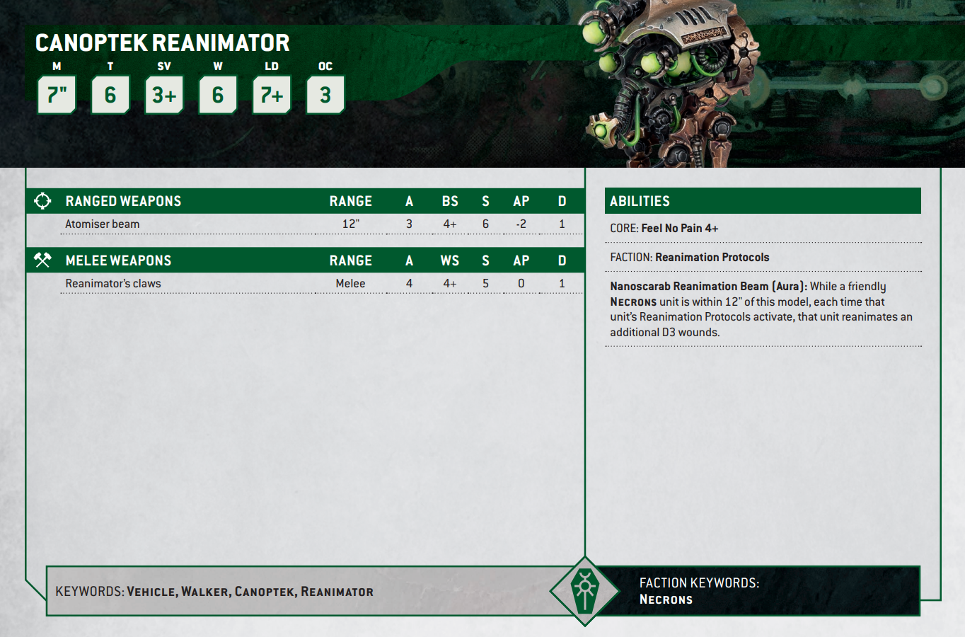 사격이랑 근접 능력은 뭐 그냥 구립니다. 하지만 이 녀석의 어빌리티를 보십시오. 무려 12인치 내의 모든 네크론 유닛에게 리애니 시마다 해당값에 d3씩 추가를 해주는 오라를 뿌립니다. 그것도 시야 상관없이!!!