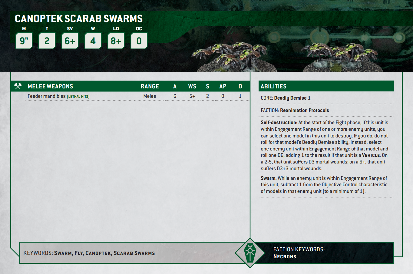이제 스캐럽을 상대방에게 그 누구보다 적극적으로 달라붙는 유닛이 되었습니다. 스캐럽의 고유 어빌리티는 파이트 페이즈 시작 시, 적 유닛의 교전거리에 들어와있는 스캐럽 하나를 선택합니다. 그 후 선택한 스캐럽을 파괴하고 대폭발을 하는 대신 주사위를 굴려 2+로 d3 모탈을, 6이 나오면 무려 d3+3 모탈을 뿌립니다. 이때 상대가 비클이라면 주사위값이 1씩 더해줍니다.