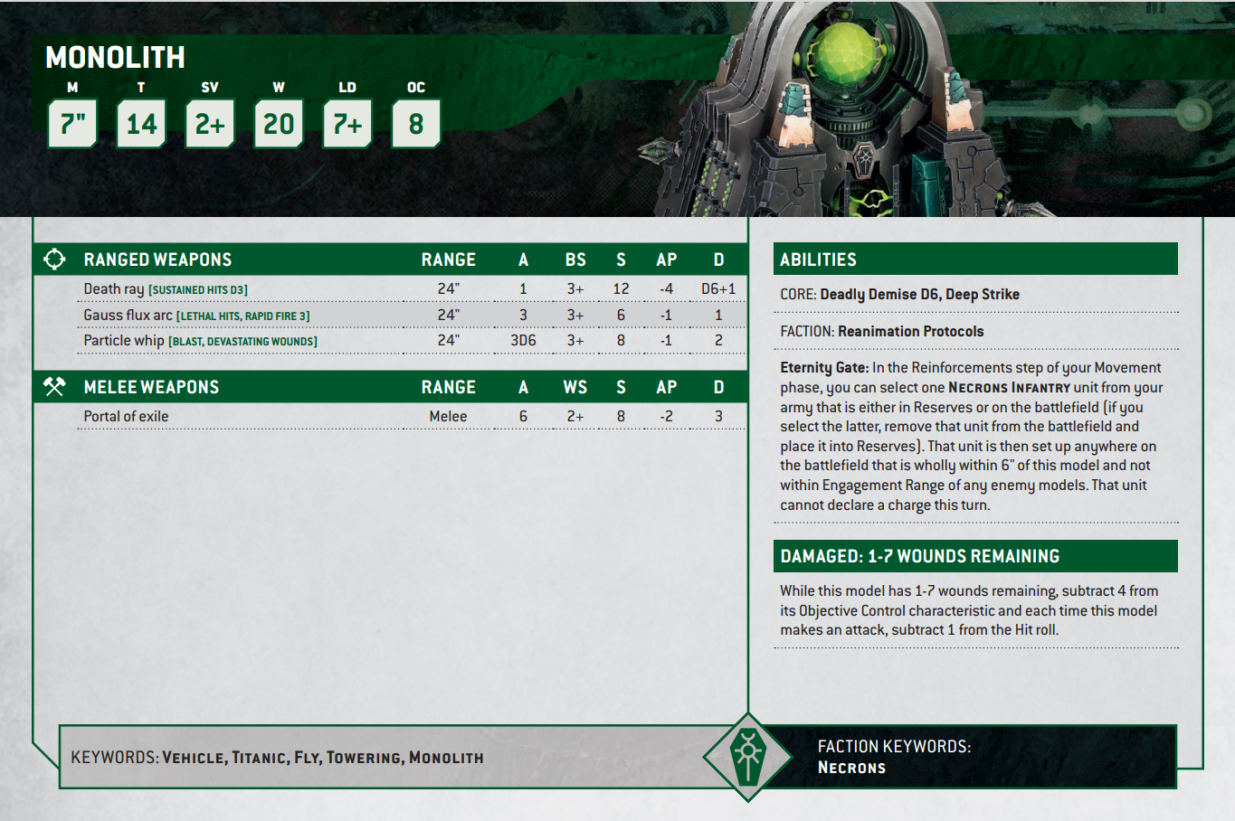 상당히 쓸만해진 모노리스입니다. 포인트가 300 후반이라 타이타닉 유닛치곤 덜 부담스럽고, 고유 어빌리티는 내 리인포스먼트 스텝 때 필드 위나 리저브 상태인 네크론 인펀트리 유닛 하나를 선택해 이 유닛의 6인치 완전히 안쪽에 재배치(적 인게이지 밖)시킬 수 있는데 차지를 못한다는 제한이 걸리긴해도 기동력이 부족한 네크론에게 상당히 큰 도움이 됩니다. 정말 매력적인 어빌리티에요.