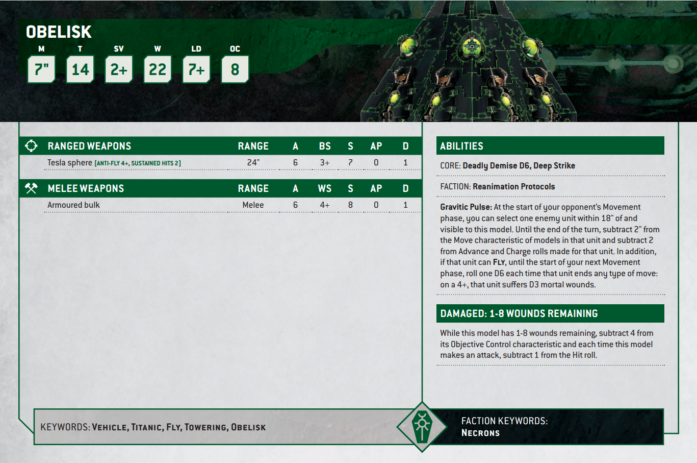 미묘한 오벨리스크입니다. 대공 유닛으로 설계된 유닛이라 무장에 [안티-플라이4+] 키워드가 붙어있으며 고유 어빌리티는 상대 이동 페이즈 시작 시, 18인치 내의 시야가 나오는 적 유닛을 하나 선택 후 해당 유닛의 이동,어드밴스,차지값을 2 빼버립니다. 거기에 더해 해당 유닛이 [플라이]키워드가 있다면, 내 다음 이동 페이즈 시작까지 해당 유닛은 그 어떤 종류건 이동을 진행할 때면 주사위를 굴려 4+로 d3모탈 데미지를 받게됩니다.