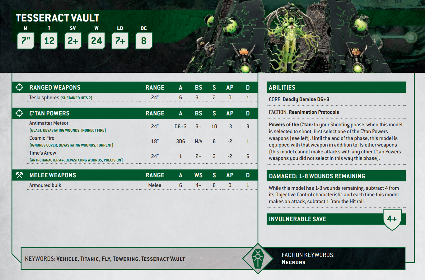 그리고 이 모든 스펙이 헛되이 날아가지않게금 자체 생존력도 굉장합니다. 운드는 20운드로 타이타닉 유닛치곤 좀 낮긴한데 그래도 최상급 T인 14에 2+세이브에요. 뿐만아니라 자체 [딥스트라이크]도 있어서 1라운드 때 선턴 뺏겨서 터질 게 불안하다면 아예 딥스로 안전하게 등장하면서 화력 투사하는 것도 가능합니다.